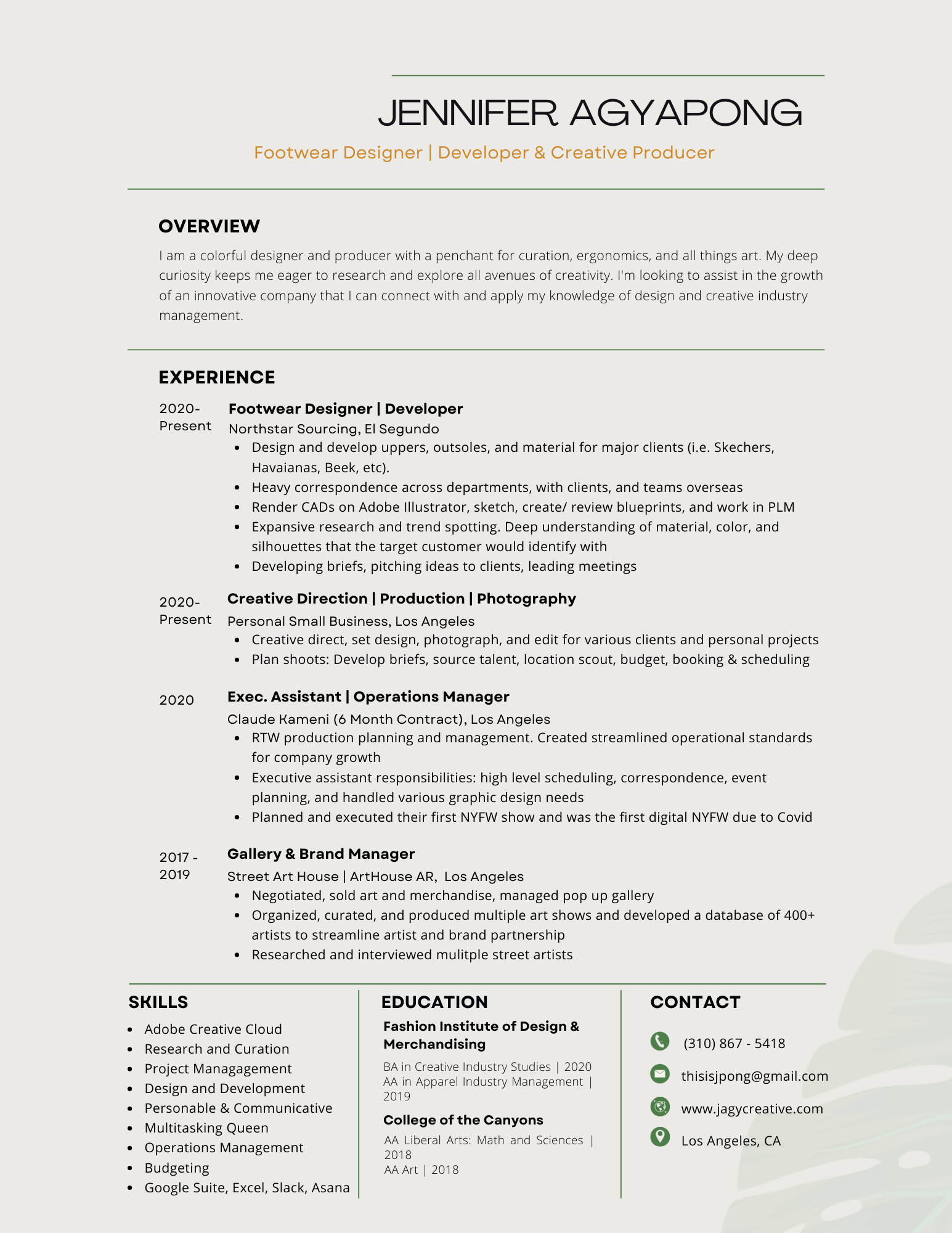 Hi, I’m from Los Angeles and I have 7+ years of experience working in creative industries and a bachelor’s degree in Creative Industry Management. I’m currently a Footwear Designer/Developer and freelance Creative Director/Producer; my days encompass the detailed planning and execution of creative projects.